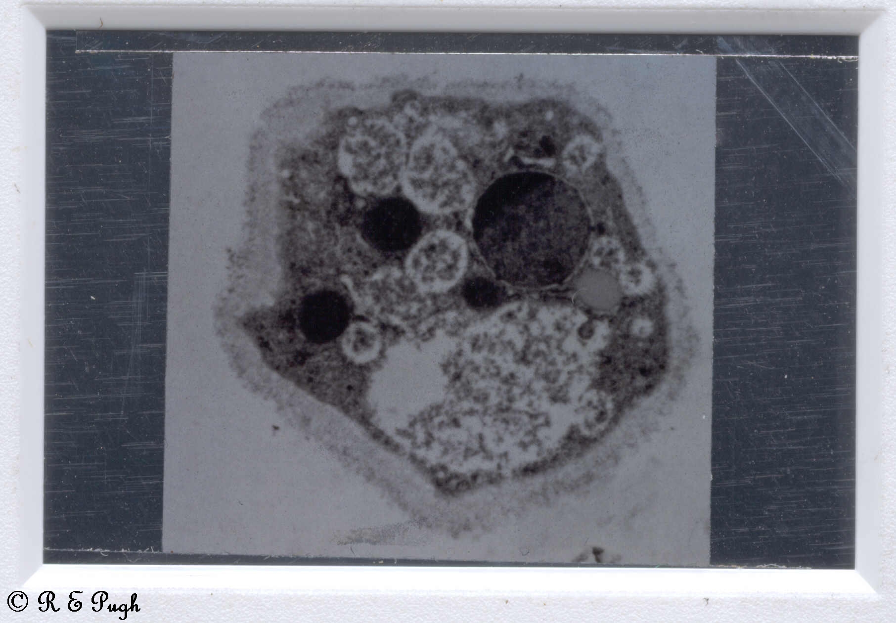 Blastocystis hominis in fresh stool - TEM. The organisms found in fresh stool are predominately multivacuolar rather than containing a single central vacuole as seen in cultured cells. A very thick surface coat often up to 5 microns thick covers the cells and bacteria are often seen associated with, or embedded in, this fibrillar matrix. (EM by Deb Stenzel). (see Boreham PFL and Stenzel DJ. 1993. Blastocystis in Humans and Animals. IN Advances in Parasitology. Vol 32. Acad Press. London). Unless the specimen is examined fresh or fixed with PVA or formalin immediately on passing, the in vivo forms ( avacuolar, amoeboid and multi- vacuolar forms) will have deteriorated and only the CV or granular forms will be seen in wet preparations, cysts will be missed if a stained smear is not examined due to their small size - 5 microns - light microscopy being the usual way to examine faecal samples.