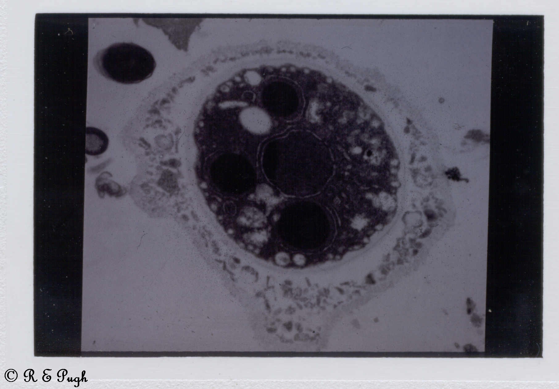 Blastocystis hominis cyst form with detached surface coat. The cysts arises from avacuolar forms in the colon, are about 5 microns wide, usually one (occ. up to 4) nucleus with a crescentic band of chromatin, thick cyst wall and very small vacuoles. It is shedding its thick fibrillar surface coat which covers the other forms of Blastocystis and may act as a mechanical and chemical protection against host responses - the cyst wall may develop under this surface coat which is shed on maturation of the cyst. The cyst wall may protect the organism from the harsh external environment. This may be the transmissible stage but this has not been proven (EM by Deb Stenzel).