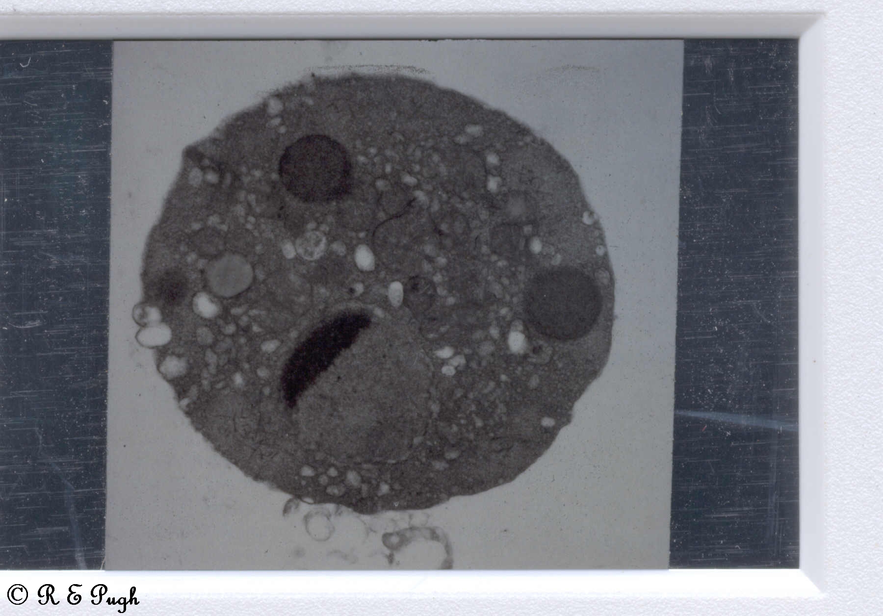 Blastocystis hominis - Avacuolar form - TEM in colonoscopy sample. Note- this organism is the form seen in vivo in humans and is without a central vacuole (unlike those in cultured cells or those in faeces passed from the gut). This cell is round to ovoid, approx 5 microns diameter with a plasma membrane but no surface coat, it has small vacuoles and vesicles in the cytoplasm, nucleus has the typical crescentic condensed band of chromatin. (EM by Deb Stenzel).